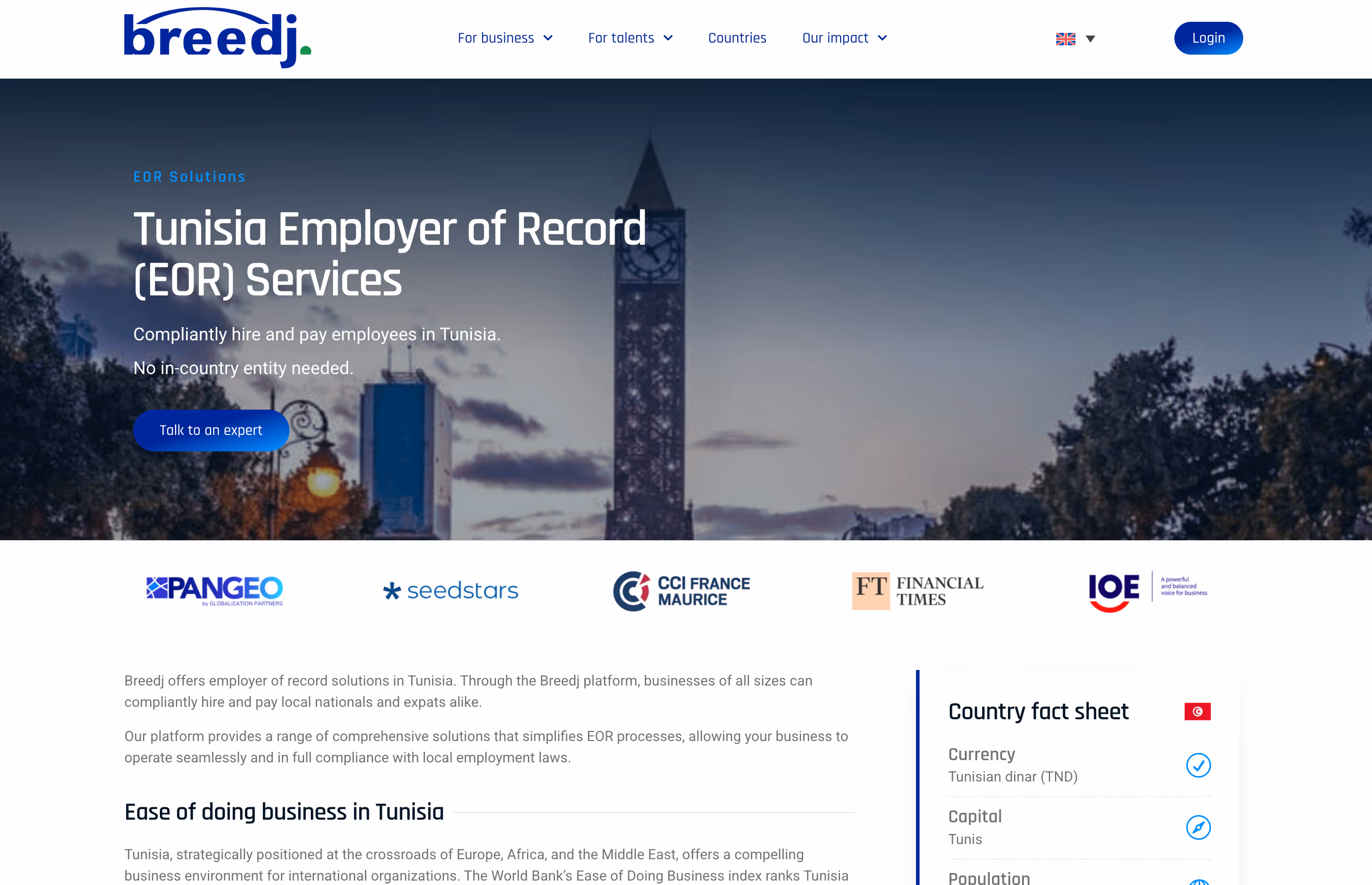 Breedj's Tunisia offering provides comprehensive EOR services at a competitive price point, making them accessible for companies with budget constraints. Their platform ensures employment contracts and statutory payments comply with Tunisian law, covering all essential aspects of local employment. The dedicated country expertise means Breedj's support team understands Tunisia-specific requirements, from contract terms to payroll processing timelines. Their professional dashboard provides client oversight of Tunisia operations, enabling employers to monitor compliance status and employment costs. With no local entity required, Breedj enables rapid market entry into Tunisia at a predictable monthly cost.
