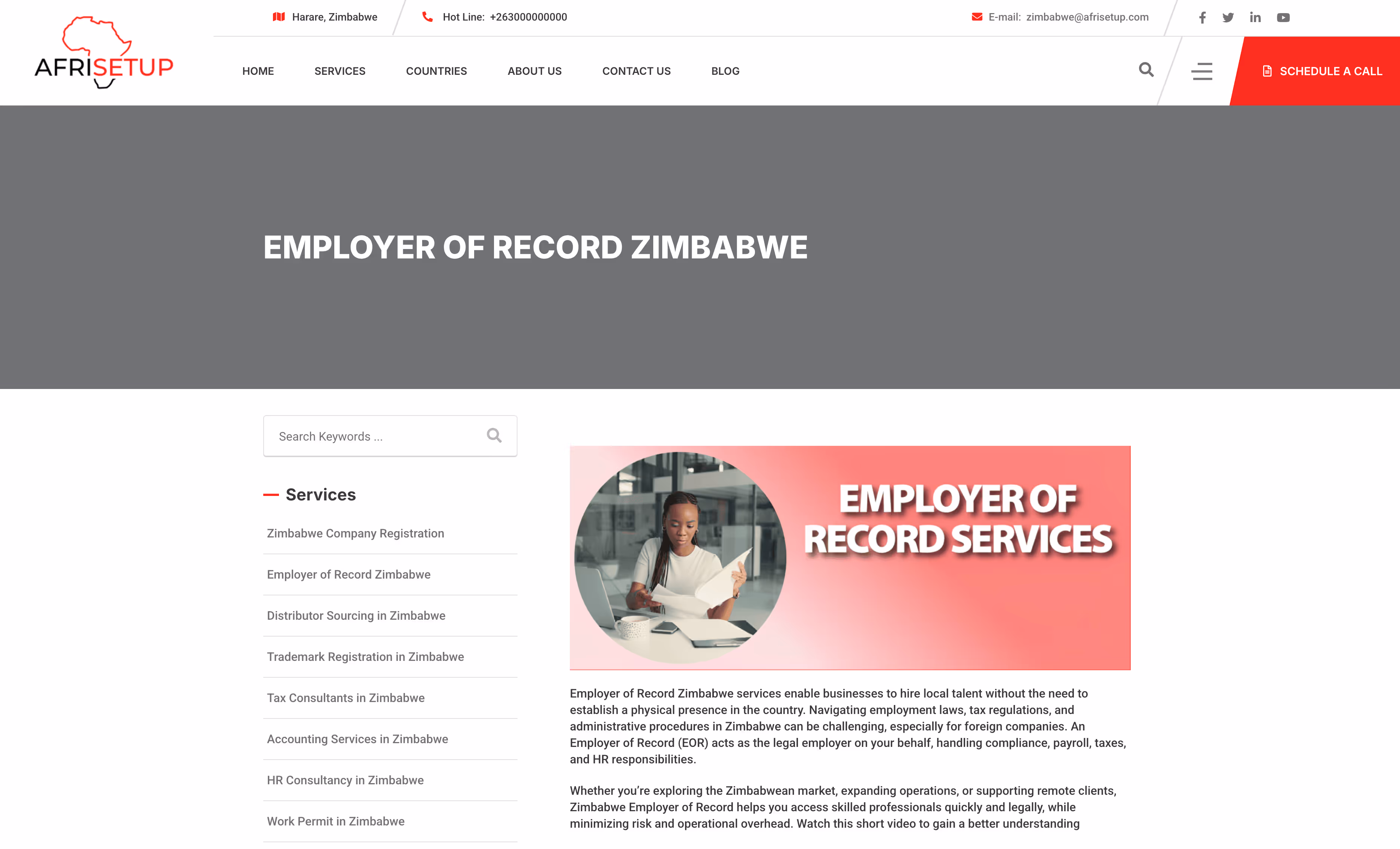 Afrisetup provides Employer of Record services across Africa with specialized focus on supporting companies entering the Zimbabwean market. Their services emphasize tailored compliance solutions and HR administration for businesses new to the region.